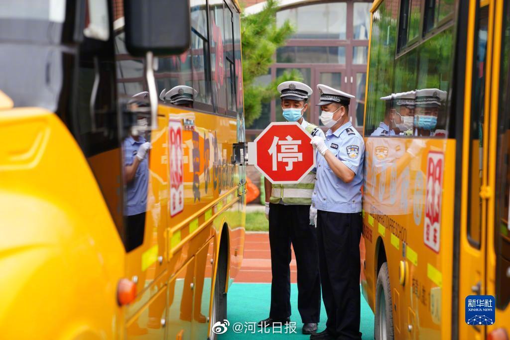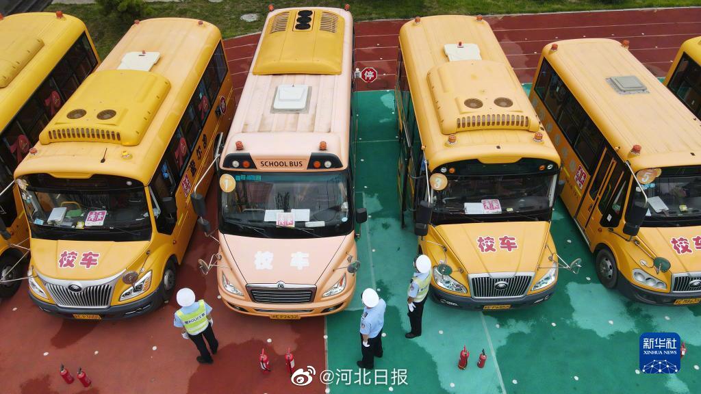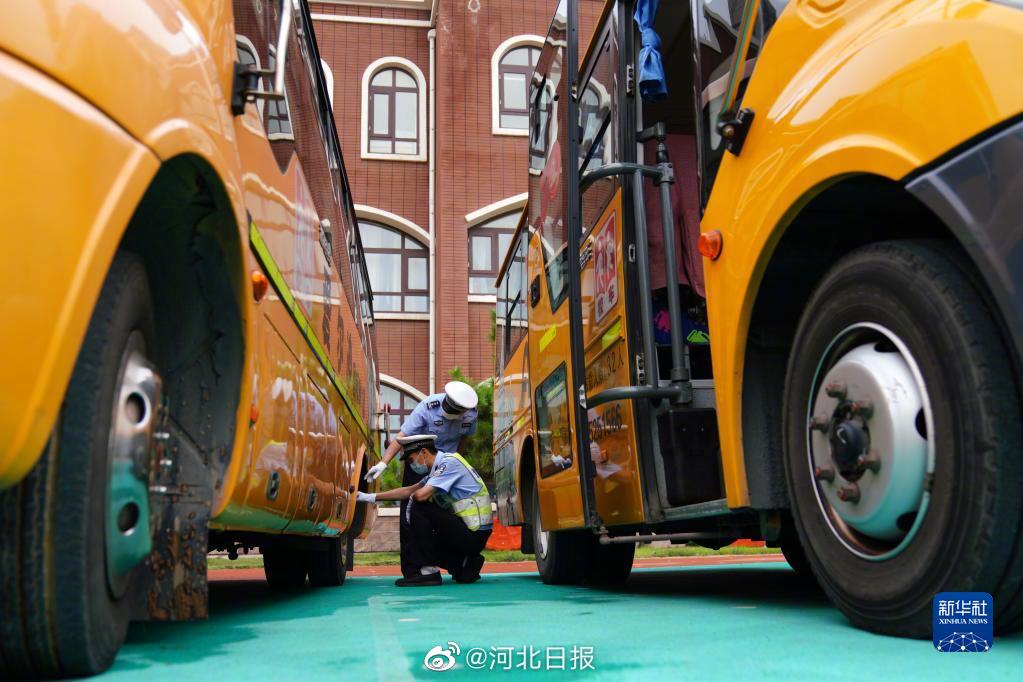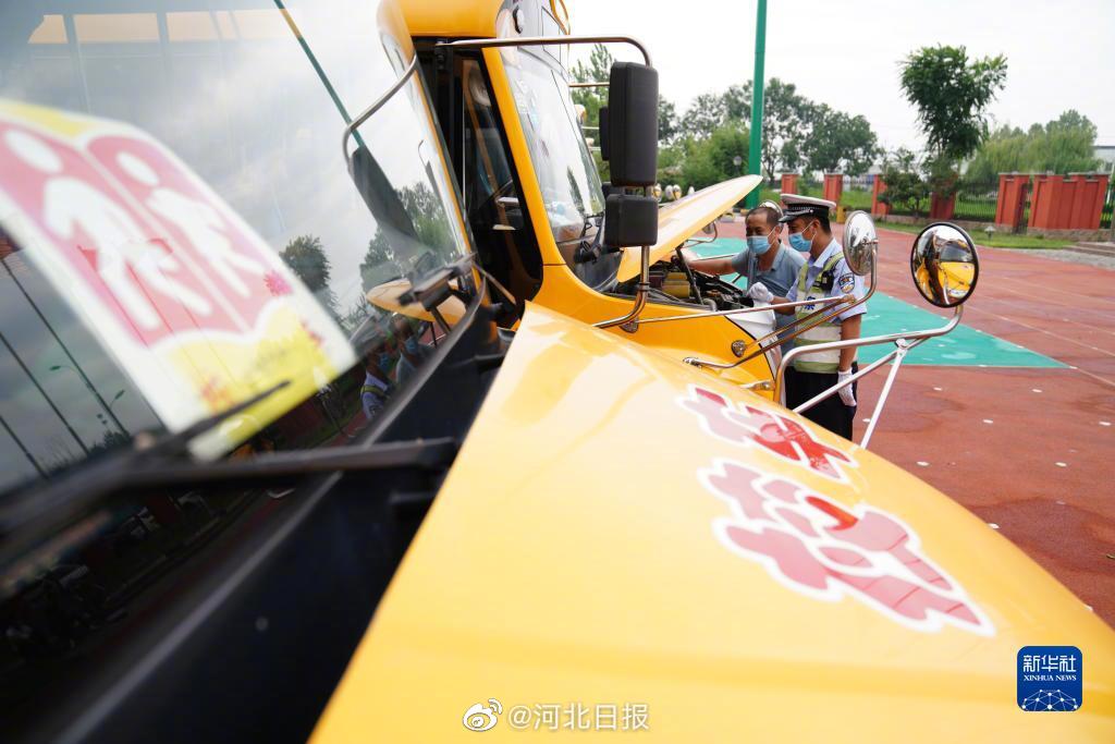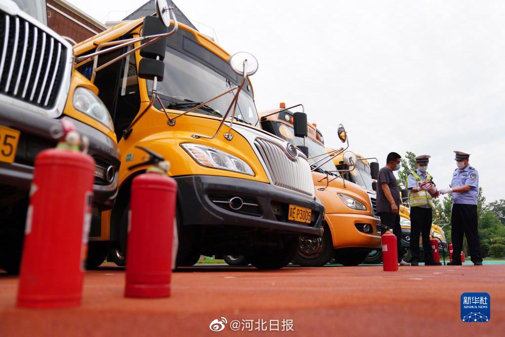 8月22日,在河北邢臺經濟開發區一幼兒園,河北省邢臺市公安交警支隊開發區大隊民警對校車配備的滅火器進行檢查。臨近開學,河北省邢臺市開展校車安全專項檢查,對中小學校、幼兒園校車的輪胎、后視鏡、停車牌、滅火器等進行檢查,以排除隱患,保障學生乘車安全,迎接新學期的到來。